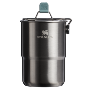 ThelightweightWildfare Go Two CupCooksetnestsneatlytogetherfor efficiency.Open the 24-ounce stainless steel pot to find two10-ouncedouble-wall insulated cups.Forone-pot cooking,unfold the handle and set the pot over your burner of choice. Thestainless steel lidincludes holes to vent,strainor release steam.All the luxury of cooking at home, in the wild.