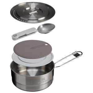 The 5-pieceWildfare Pro SaucepanCookset lets you cook with precision on any camp stove. Made of tri-ply bonded stainless steel, the saucepan distributes heat evenly for expert control, while the vented lid is also a strainer. Packed for efficiency, a nonslip cutting board with a removable trivet and a folding spoon nest together, so you can cook delicious meals outdoors.